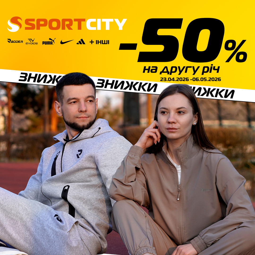 Увага, пошановувачі активного життя! У SPORT CITY — -50% на кожну другу річ з 23 квітня по 6 травня 2026р. Два товари — платиш менше, ніж очікував. Діє на весь асортимент + сезонні знижки. Деталі — у магазині SPORT CITY або на sportcity.ua