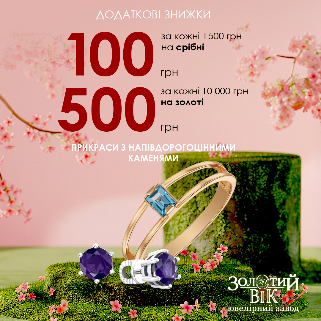 100 грн за кожні 1500 грн на срібні прикраси з напівдорогоцінними каменями.